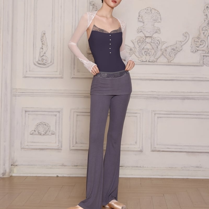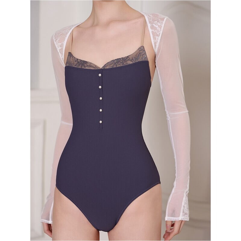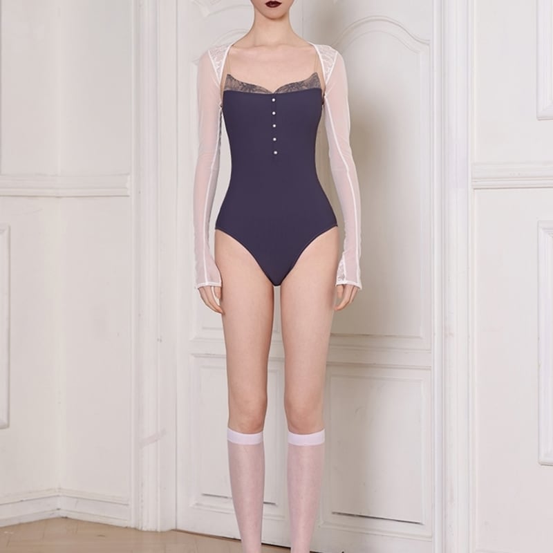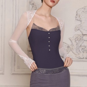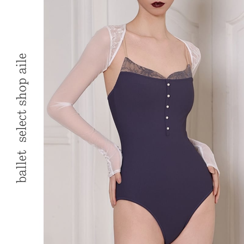 【商品管理番号】 A0175 【商品説明】 デコルテまわりに施された上品なレースの透け感が魅力のレオタードです。シックな配色で構成されたデザインは、どんなシーンにもマッチし、優雅な印象を与えます。美しいシルエットと動きやすさを兼ね備えたこのレオタードは、ダンスパフォーマンスや日常の練習にぴったりです。※ボレロは付属しません。 【サイズ】 【S】胸囲:62.4cm/ウエスト:51.7cm/ヒップ:68cm/着丈:53cm 【M】胸囲:66.4cm/ウエスト:55.4cm/ヒップ:72cm/着丈:53.9cm 【L】胸囲:70.4cm/ウエスト:59.2cm/ヒップ:76cm/着丈:54.9cm 【XL】胸囲:74.4cm/ウエスト:62.9cm/ヒップ:80cm/着丈:55.9cm 【カラー】 ネイビー 【素材】 ナイロン80%/ ポリウレタン20%