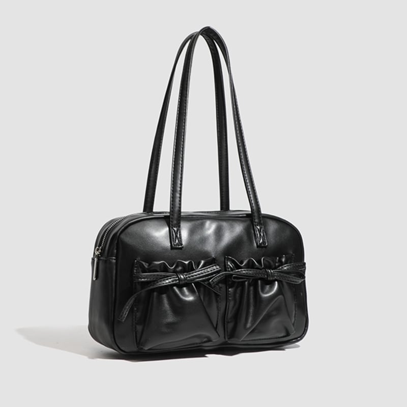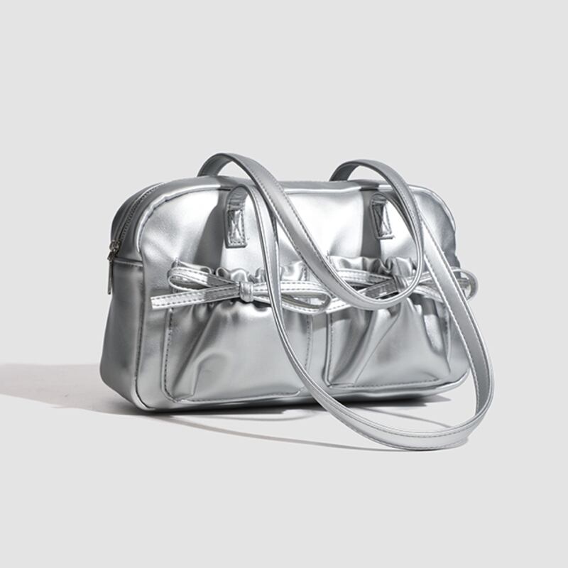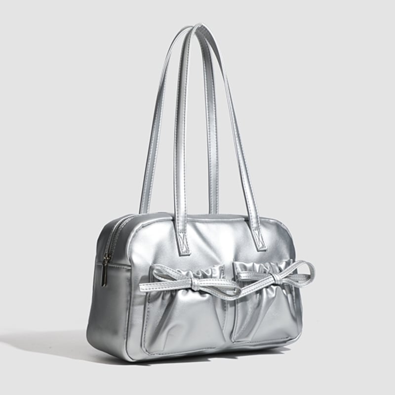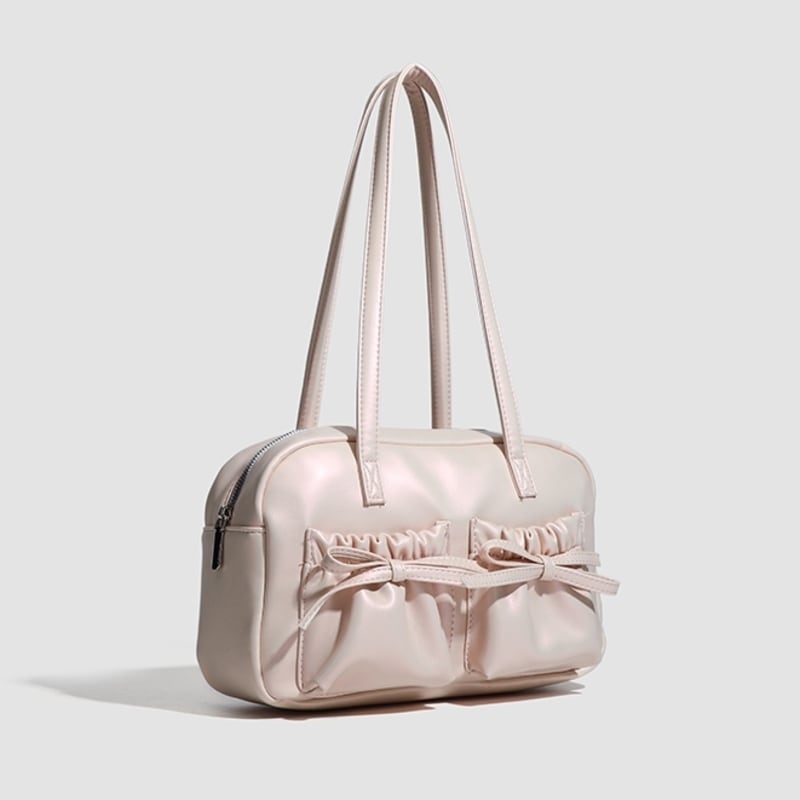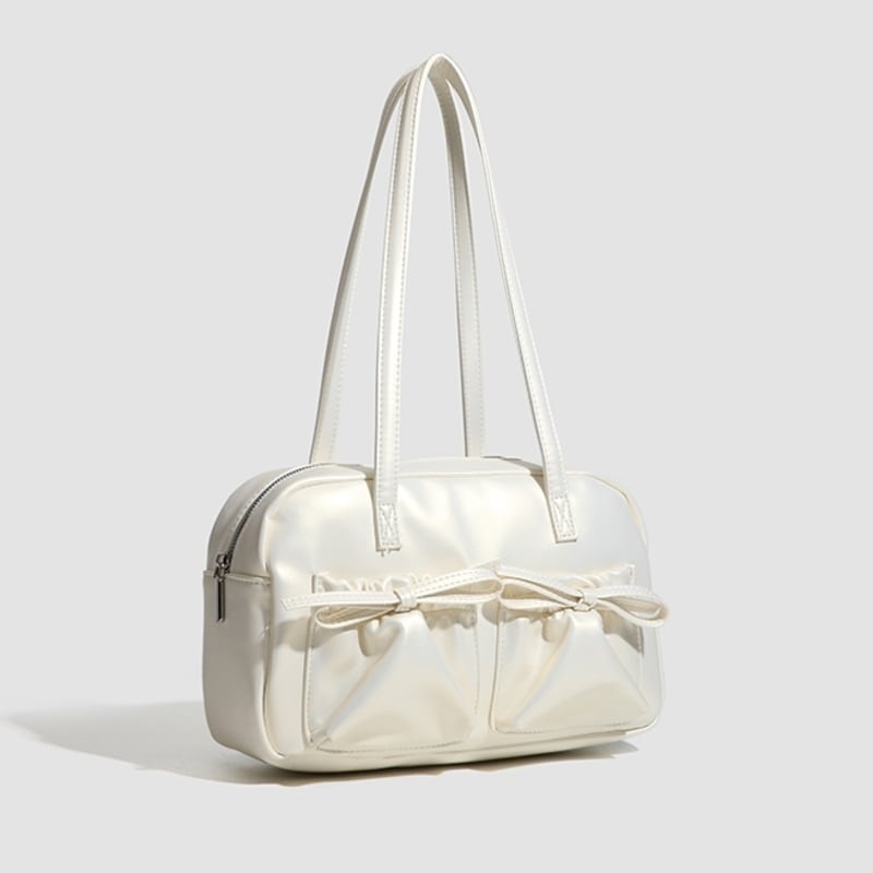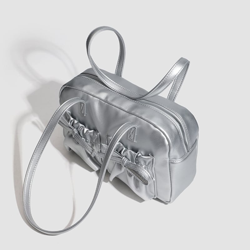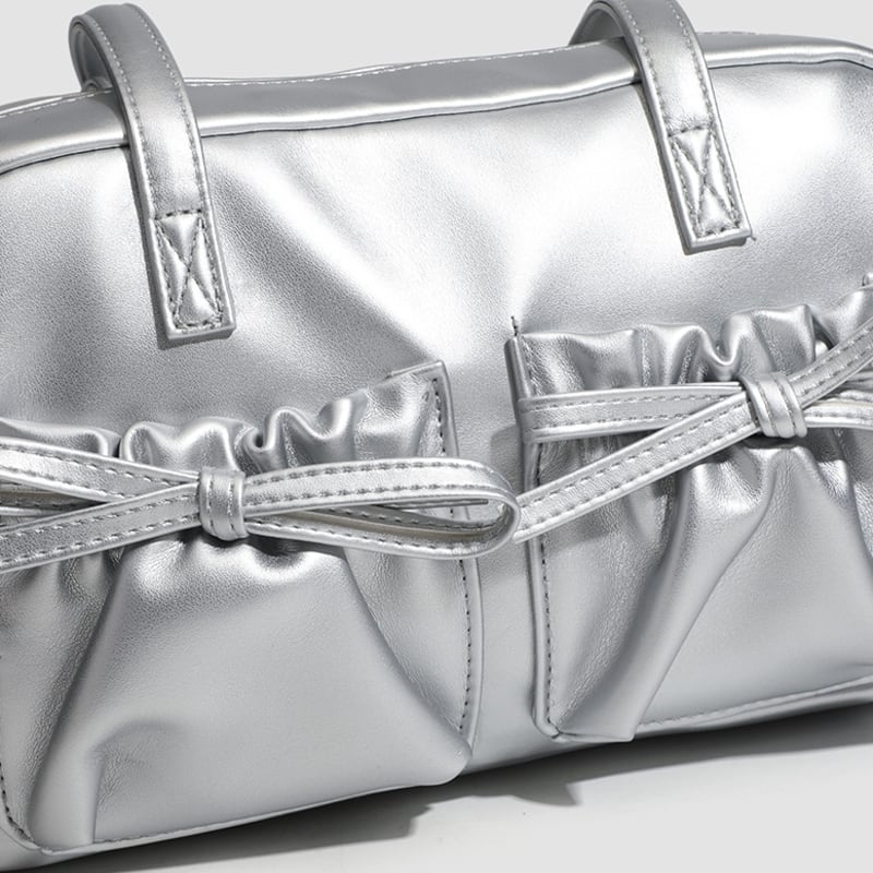 【商品管理番号】 A0269 【商品説明】 くしゅっとしたリボン付きポケットが可愛さを引き立てるショルダーバッグです。ころんとしたボストン型がアクセントとなり、カジュアルながらもおしゃれな印象を与えてくれます。しっかりとしたマチ付きで、レッスンバッグや普段使いにも最適なアイテムです。日常のスタイルに彩りを加えてくれること間違いなしです! 【サイズ】 【FREE】高さ:18cm/横:29cm/マチ:8cm 【カラー】 オフホワイト ピンク シルバー ブラック 【素材】 表:PU 裏地:ポリエステル