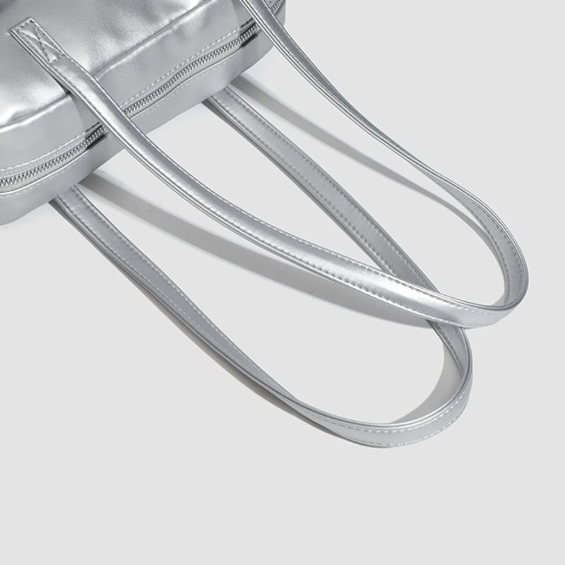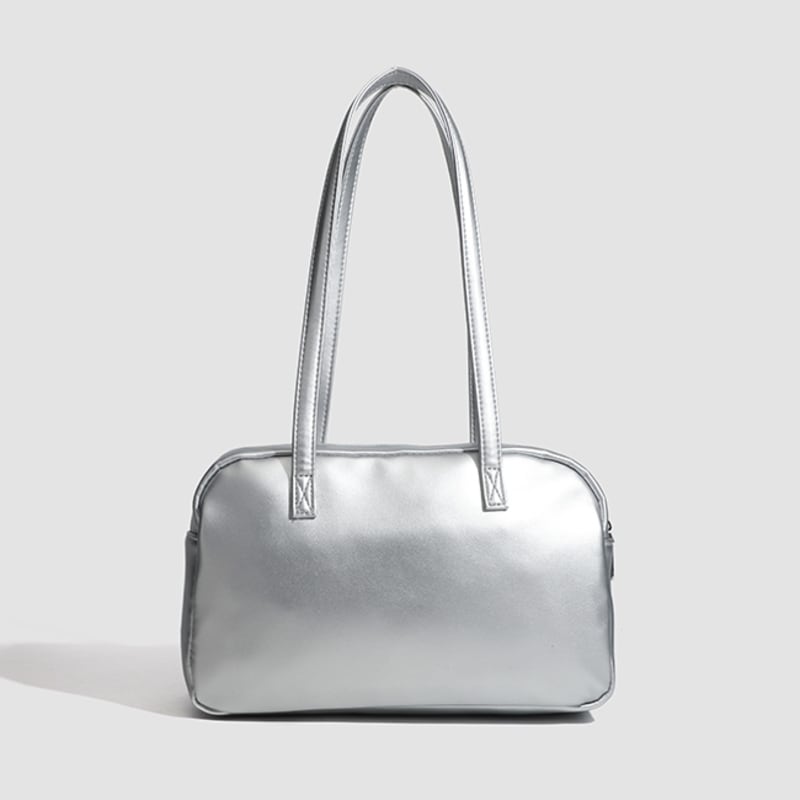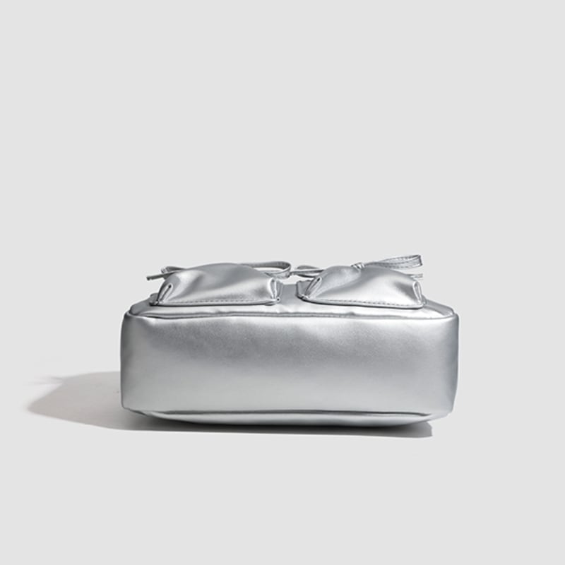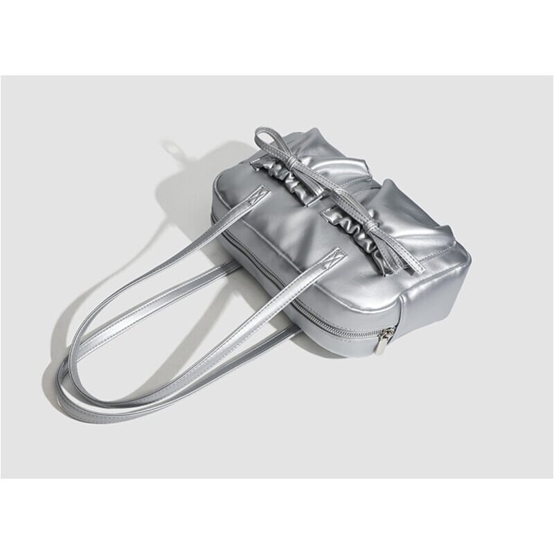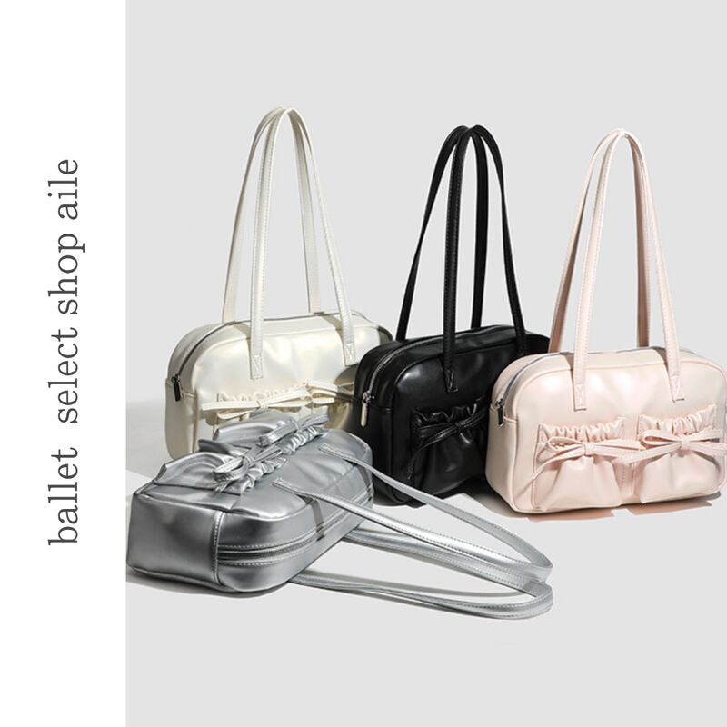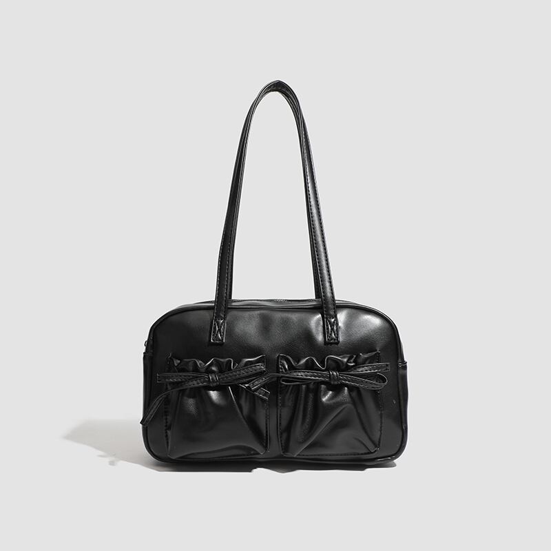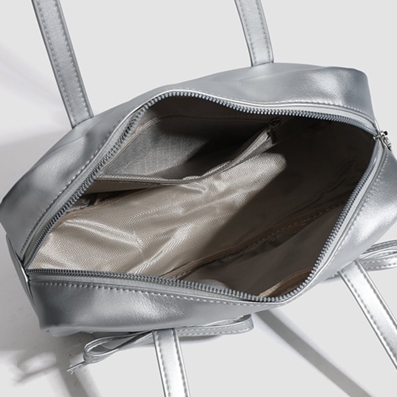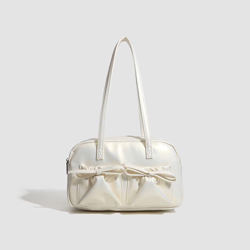 【商品管理番号】 A0269 【商品説明】 くしゅっとしたリボン付きポケットが可愛さを引き立てるショルダーバッグです。ころんとしたボストン型がアクセントとなり、カジュアルながらもおしゃれな印象を与えてくれます。しっかりとしたマチ付きで、レッスンバッグや普段使いにも最適なアイテムです。日常のスタイルに彩りを加えてくれること間違いなしです! 【サイズ】 【FREE】高さ:18cm/横:29cm/マチ:8cm 【カラー】 オフホワイト ピンク シルバー ブラック 【素材】 表:PU 裏地:ポリエステル
