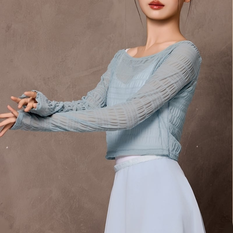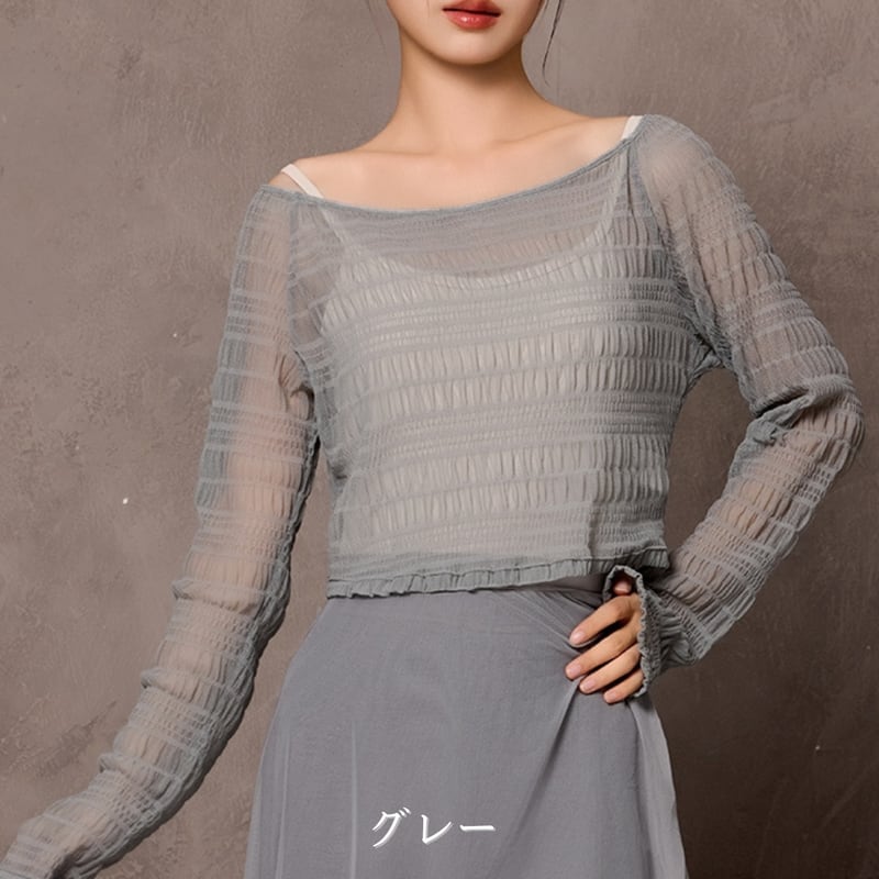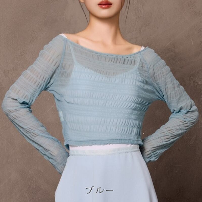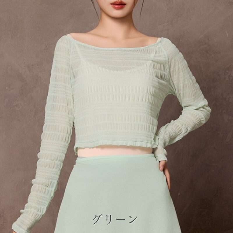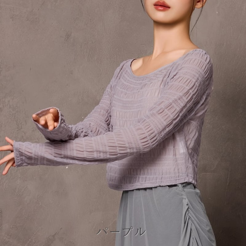 【商品管理番号】 A0195 【商品説明】 メロウなニュアンスが施された、こなれ感のあるショート丈トップスです。透け感のある素材が大人の女性らしさを引き立て、さらりとした肌触りは軽やかな質感を実現しています。シンプルながらもおしゃれ感を醸し出すデザインで、スポーツからちょっとしたお出かけまで幅広く活躍します。 【サイズ】 【S】バスト:77cm/袖丈:61.5cm/着丈:32cm 【M】バスト:81cm/袖丈:63cm/着丈:33.5cm 【L】バスト:85cm/袖丈:64.5cm/着丈:35cm 【XL】バスト:89.5cm/袖丈:66cm/着丈:37cm 【2XL】バスト:94cm/袖丈:67.5cm/着丈:39cm 【カラー】 アプリコット ブラック ピンク グリーン パープル ブルー ブラウン グレー 【素材】 ナイロン98%/ポリウレタン2%