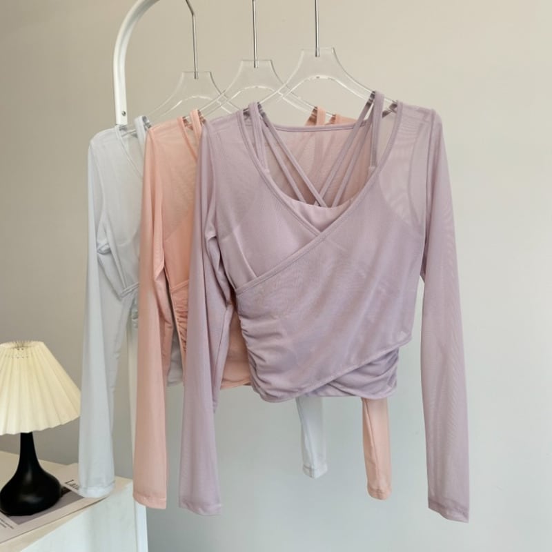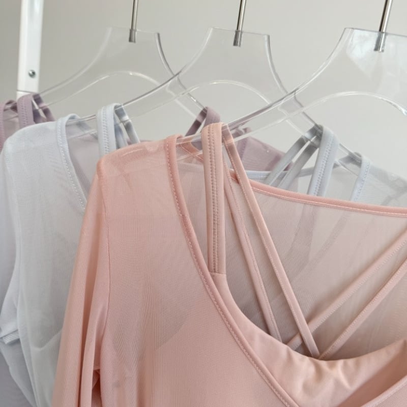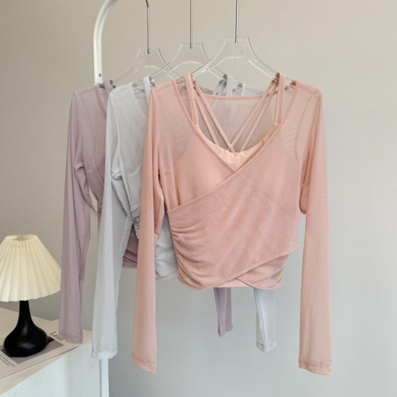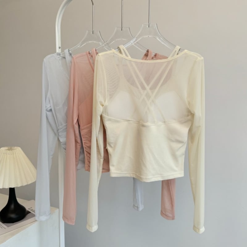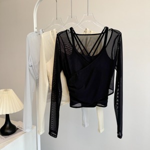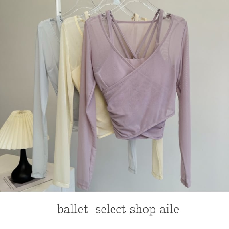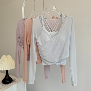 【商品管理番号】 A0201 【商品説明】 メロウなニュアンスが施された、こなれ感のあるクロスショート丈トップスと便利なバッククロスインナーのセットです。透け感のある素材が大人の女性らしさを引き立て、さらりとした軽やかな質感を実現しています。シンプルながらもおしゃれ感を醸し出すデザインで、スポーツからちょっとしたお出かけまで幅広く活躍します。 【サイズ】 【S】バスト:64cm/肩幅:29cm/着丈:39cm 【M】バスト:68cm/肩幅:31cm/着丈:40cm 【L】バスト:72cm/肩幅:33cm/着丈:41cm 【XL】バスト:76cm/肩幅:345cm/着丈:42cm 【カラー】 オフホワイト ピンク ライトブルー パープル ブラック 【素材】 ナイロン100%