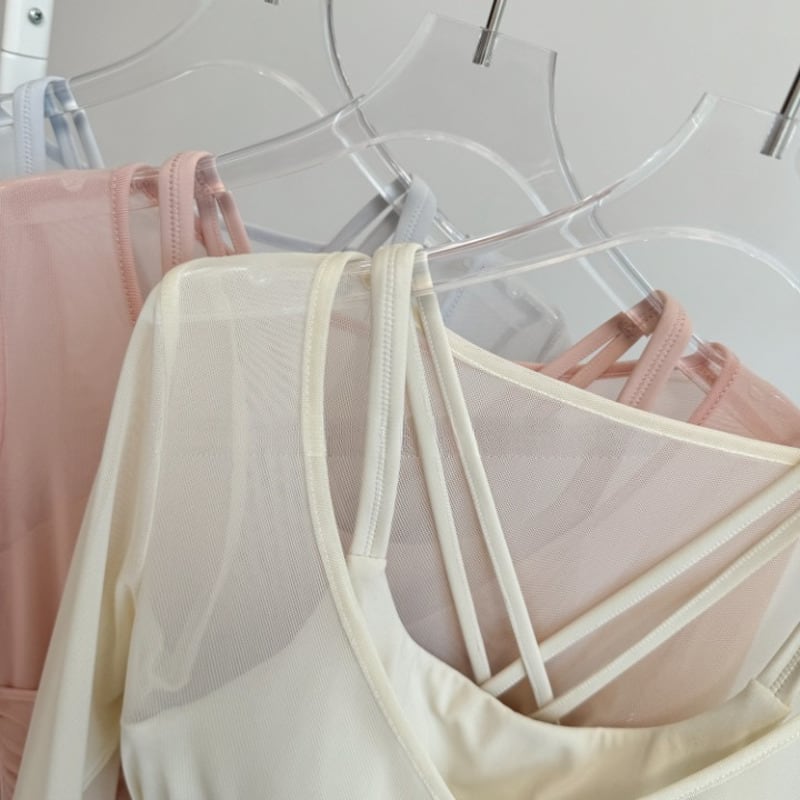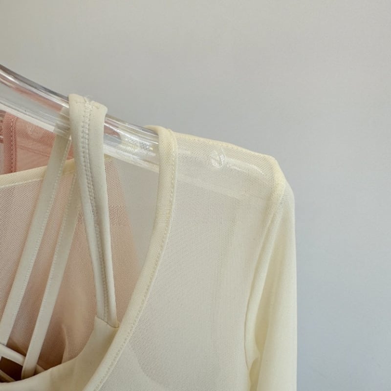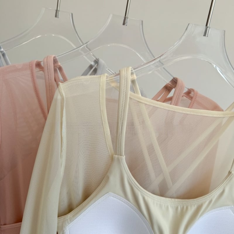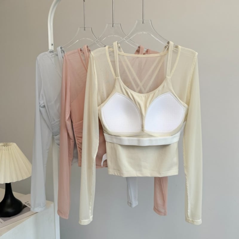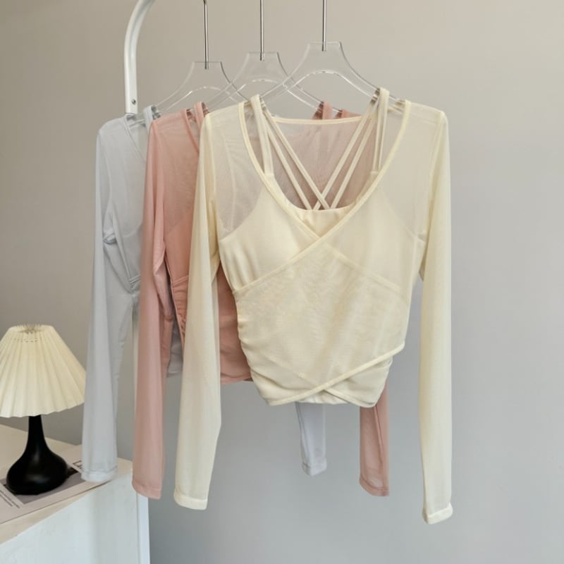 【商品管理番号】 A0201 【商品説明】 メロウなニュアンスが施された、こなれ感のあるクロスショート丈トップスと便利なバッククロスインナーのセットです。透け感のある素材が大人の女性らしさを引き立て、さらりとした軽やかな質感を実現しています。シンプルながらもおしゃれ感を醸し出すデザインで、スポーツからちょっとしたお出かけまで幅広く活躍します。 【サイズ】 【S】バスト:64cm/肩幅:29cm/着丈:39cm 【M】バスト:68cm/肩幅:31cm/着丈:40cm 【L】バスト:72cm/肩幅:33cm/着丈:41cm 【XL】バスト:76cm/肩幅:345cm/着丈:42cm 【カラー】 オフホワイト ピンク ライトブルー パープル ブラック 【素材】 ナイロン100%